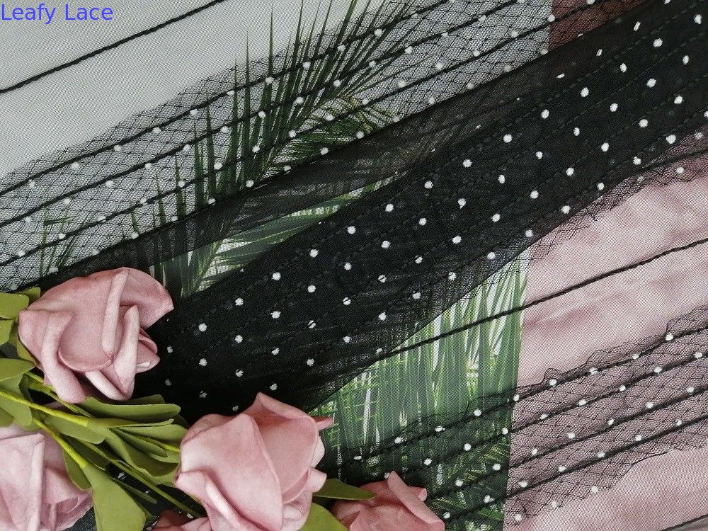 Tela negra de la tela de Mesh Embroidery Dot Flocked Mesh para las especificaciones del vestido de la niña de Dress Garment Brands del vestido de noche de señora: