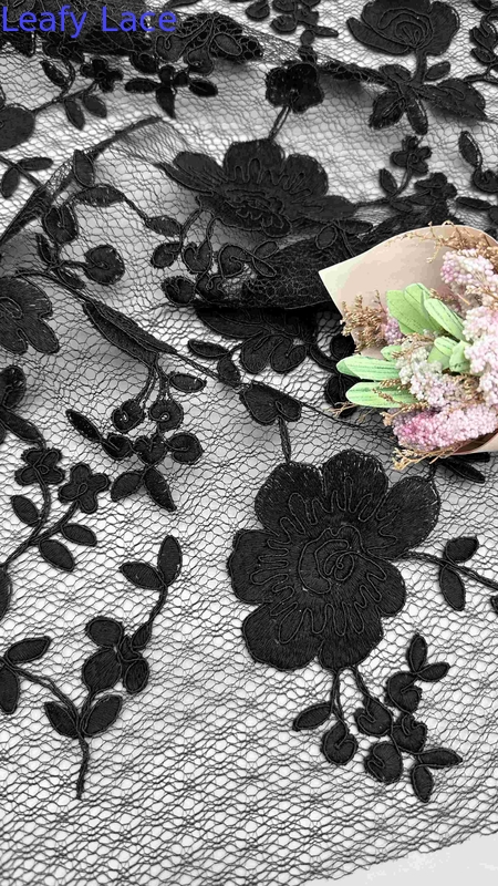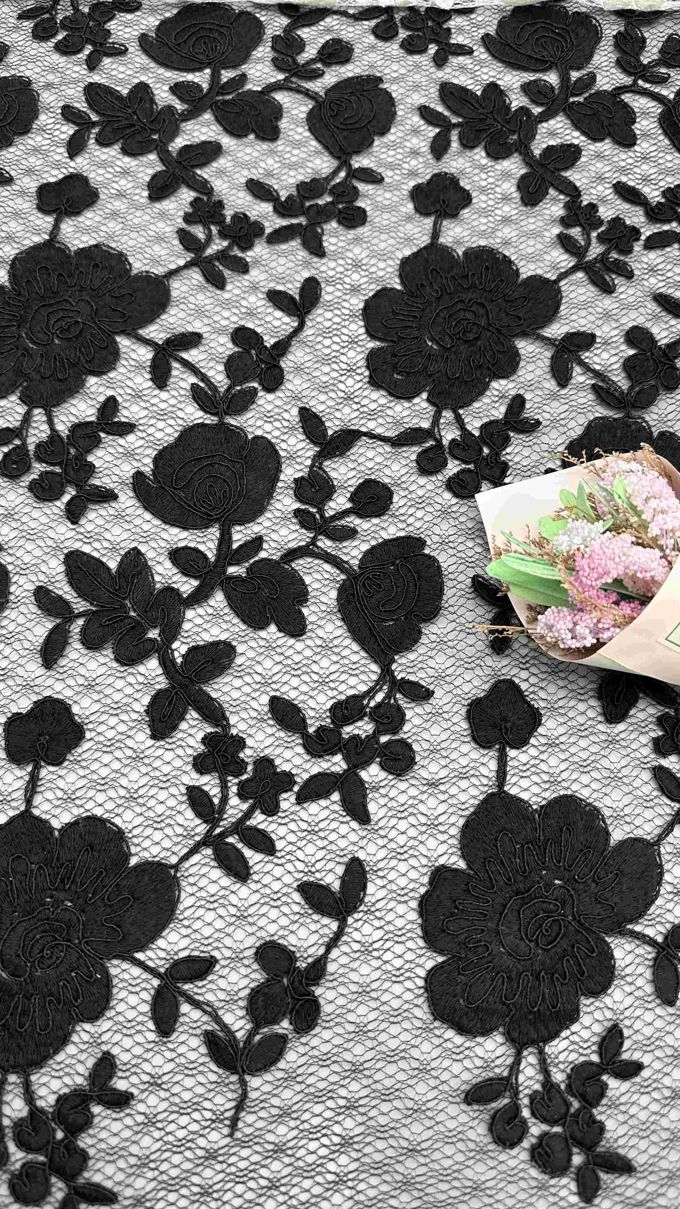 | Resaltar: | Tejido de encaje de malla bordado con patrón floral,Tejido de encaje de malla bordada negra,Tejido de encaje de malla bordada de 129 cm |