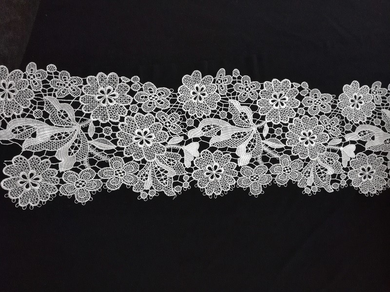 El ajuste blanco 100% del cordón del poliéster es conveniente para los vestidos de los vestidos, de la falda, de las niñas de las mujeres, las materias textiles caseras, la cortina, los artículos del lecho, las ropas, los sombreros, los vestidos de boda, las blusas, el etc.