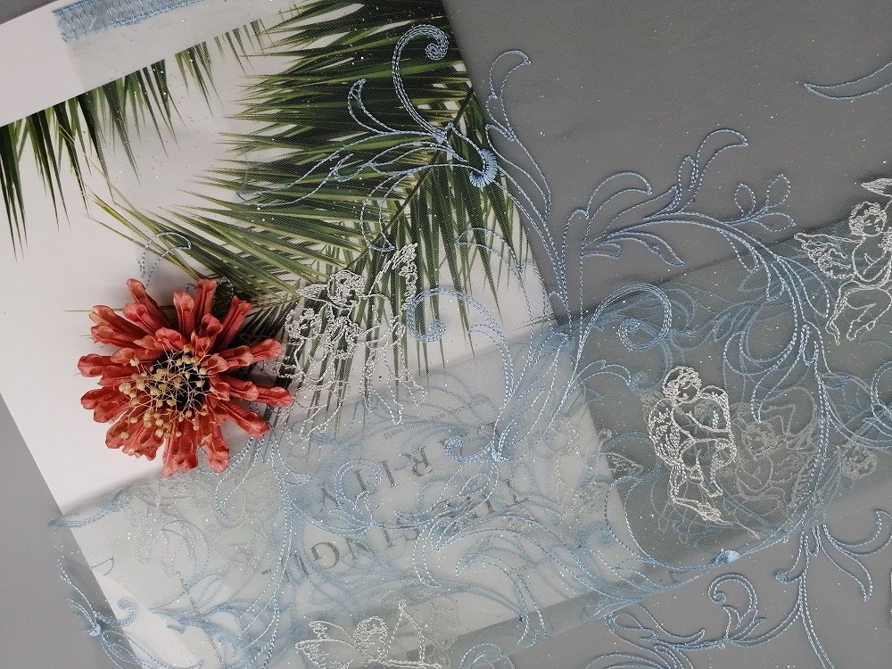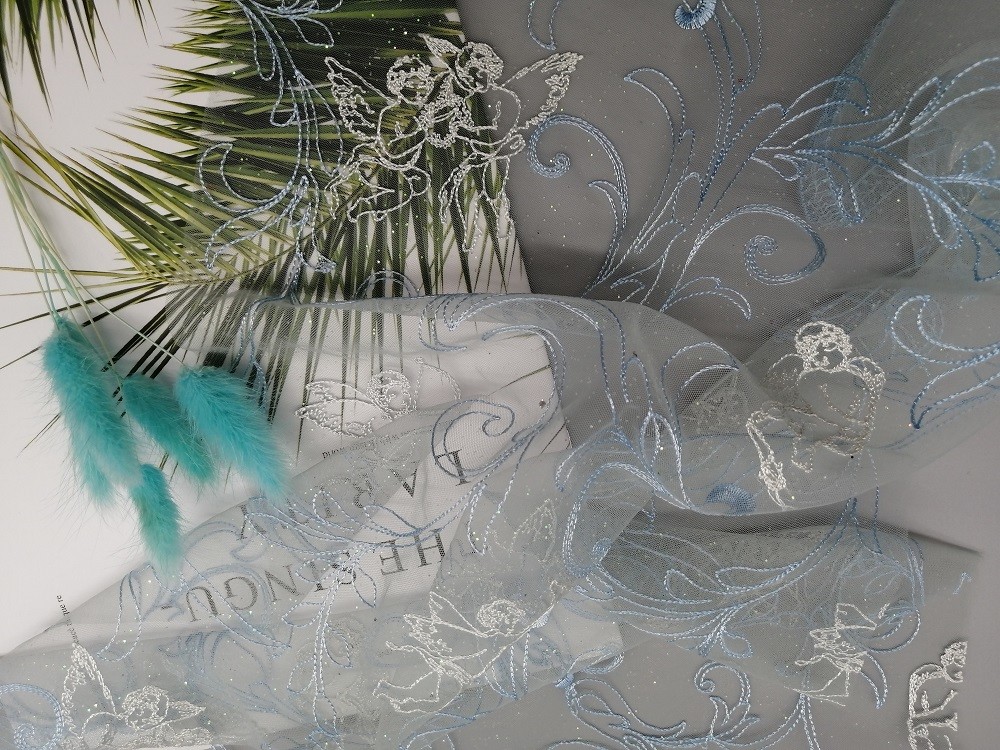- Los vendedores enteros de la tela del bordado de Bule Tulle Mesh Foil Printed Foil Coated para las marcas de la ropa cumplen el requisito del estándar 100 de OEKO-Tex.