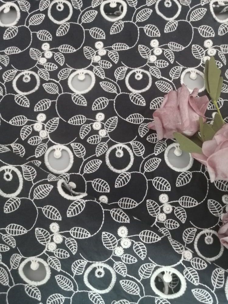 Esto Tela bordada del ojeteador se hace de la gasa de alta calidad del algodón del 100% Comed que es suave. El algodón brillante estupendo Voil tiene gran breathability. Backgroud negro y mirada bicolor del contraste de algodón de los creats blancos del hilo. El agujero delicado del ojeteador es junto pequeño diseño floral muestra el modelo único. Tiene bastante greige en existencia para la entrega rápida.