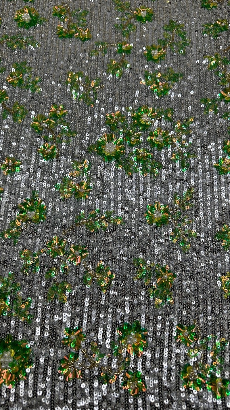 La malla de la tela no solo proporciona un hermoso contraste con las lentejuelas, sino que también asegura que el vestido es transpirable y cómodo de usar.El tejido bordado de paletas de flores es sorprendentemente ligeroEl bordado en sí es un testimonio de la meticulosa atención al detalle.con cada punto contribuyendo al diseño general y asegurando que las lentejuelas estén bellamente enmarcadas.