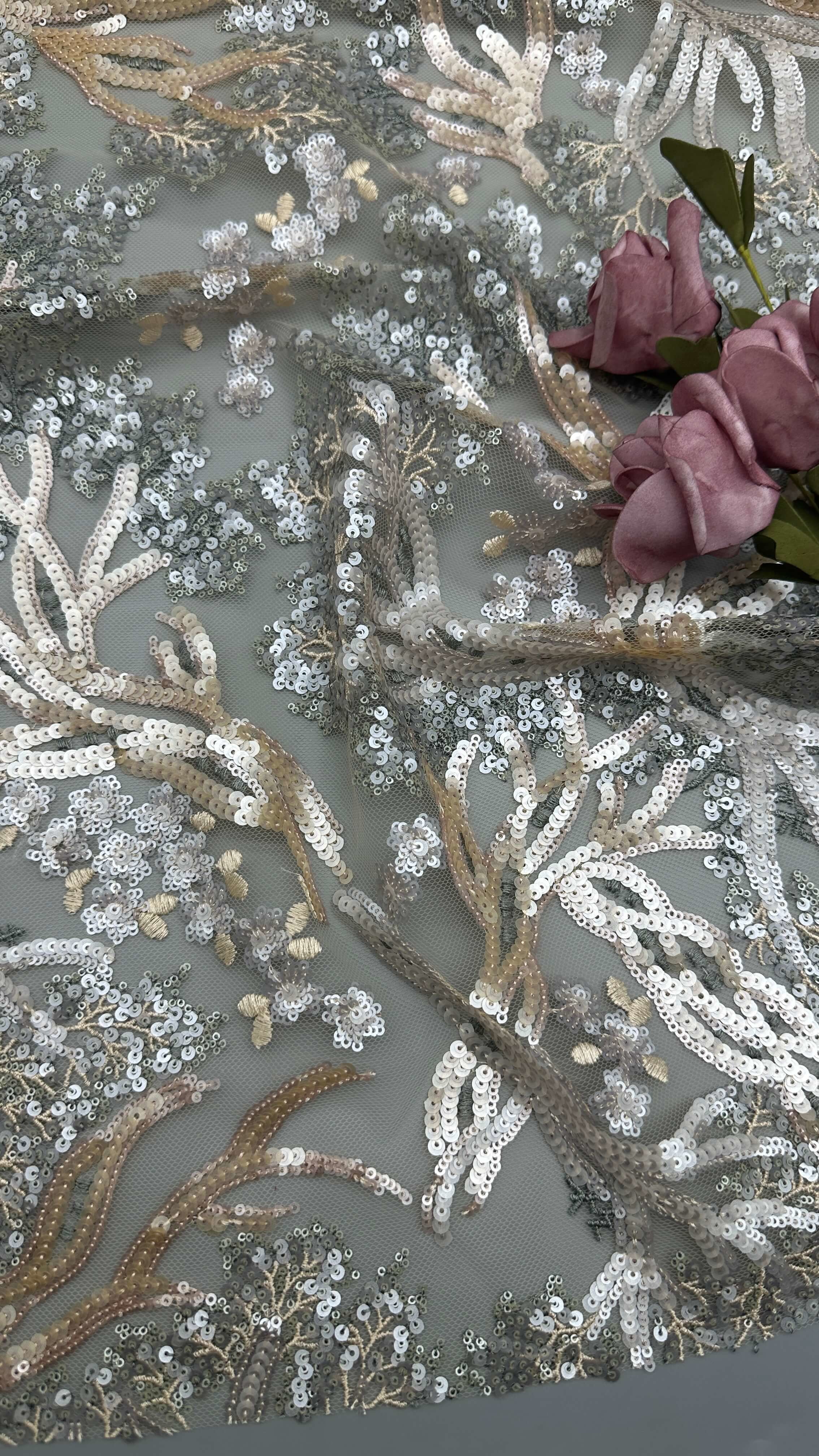 | Resaltar: | Tejido de encaje de bordado de seda duradero,Elegante tejido de encaje bordado con sequin,Tejido de encaje de bordado de seda de lujo |