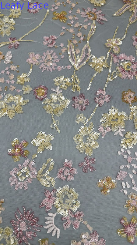 | Resaltar: | Tejido bordado de lentejas florales en 3D,Tejido bordado de seda de lujo para ocasiones,Elegante tejido bordado con paletas de seda |