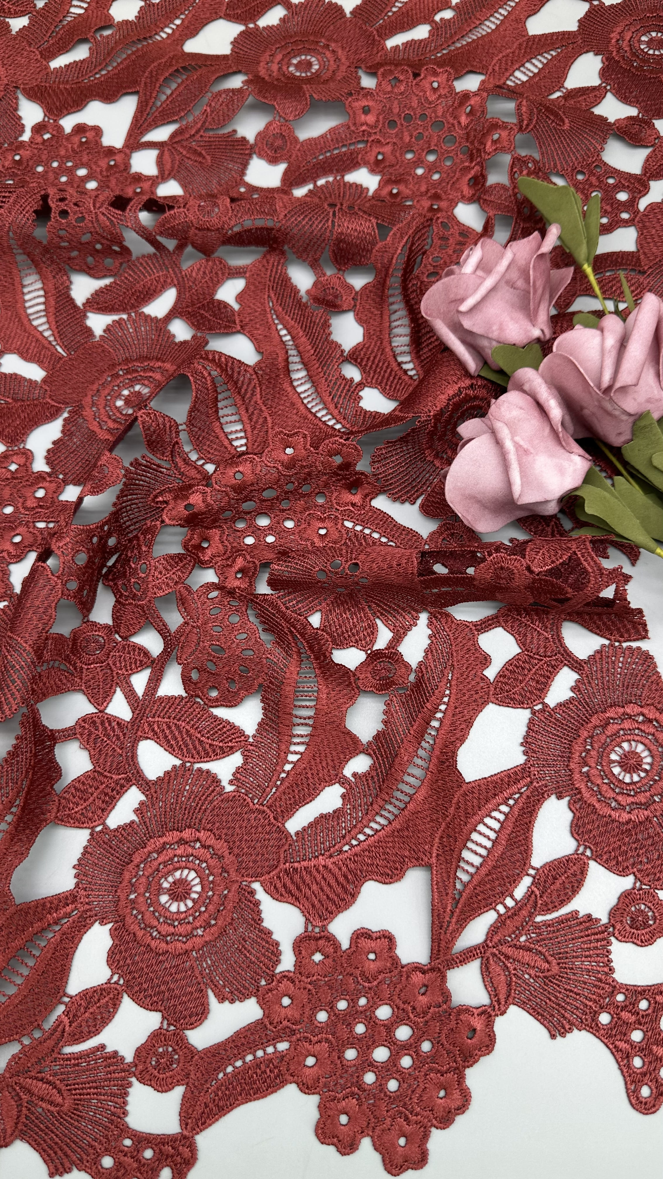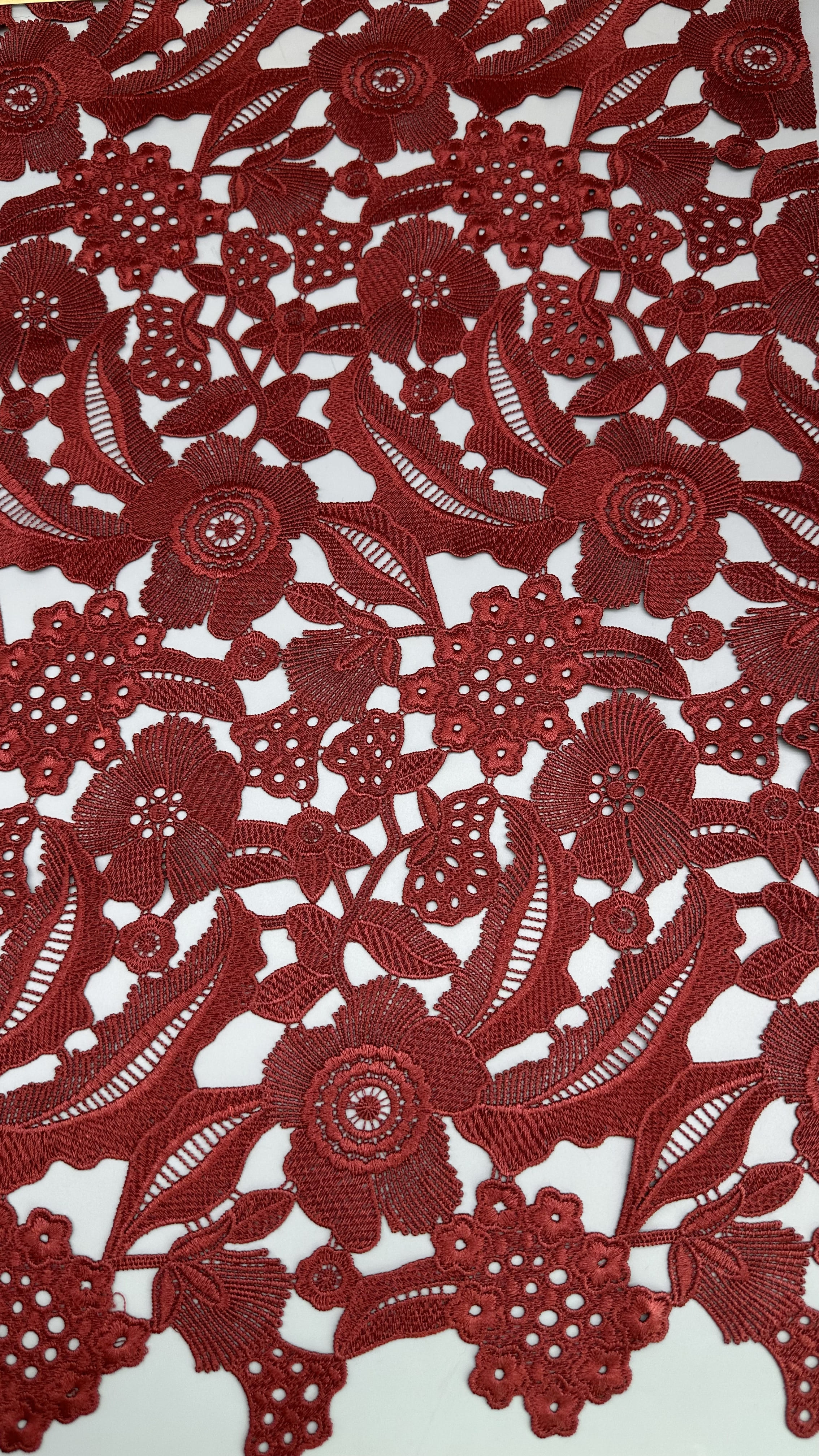 | Resaltar: | El tejido de encaje de respiración vacía,Tejido de encaje de bordado con hojas,Elegante tejido de encaje de color rojo |