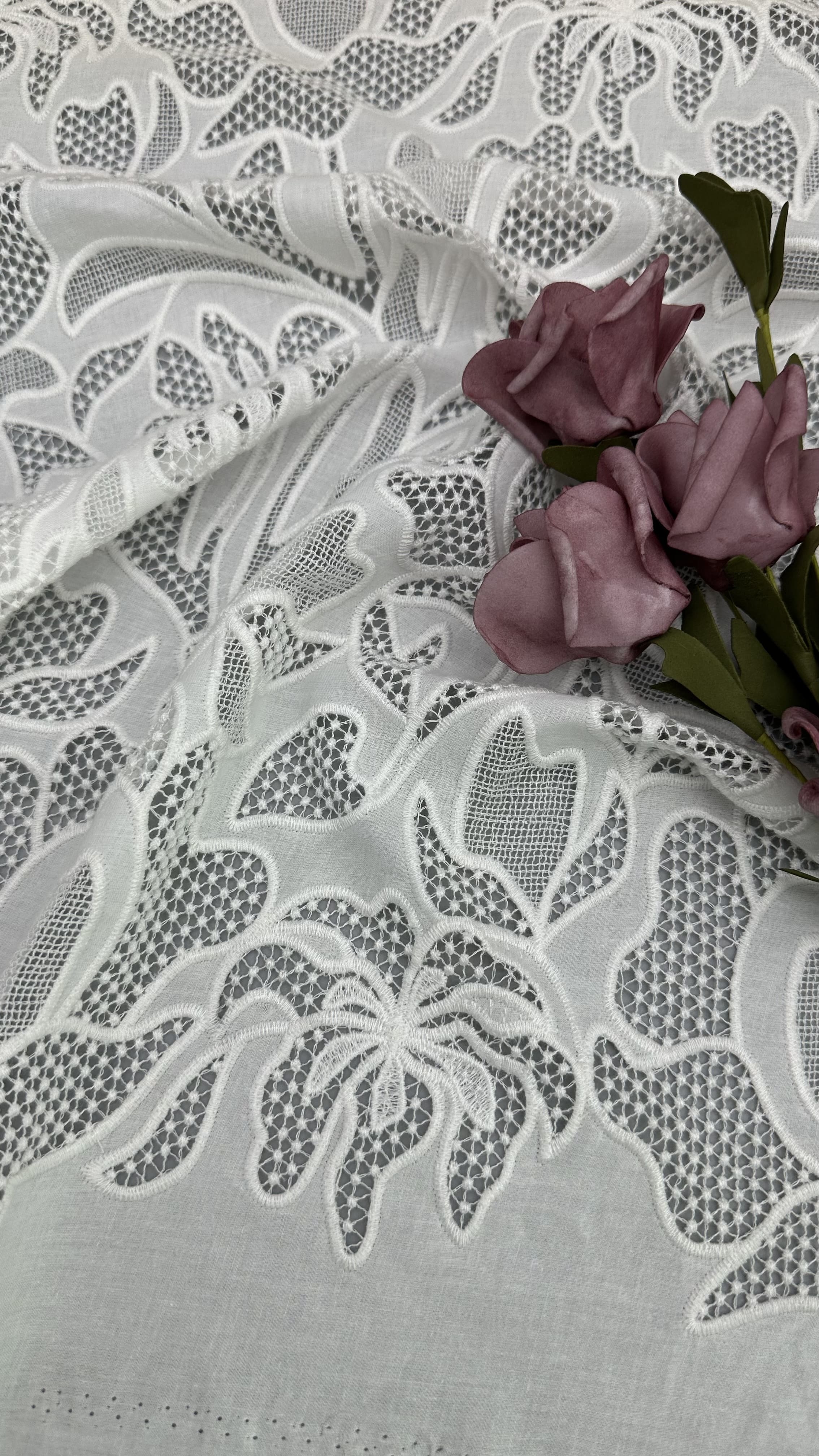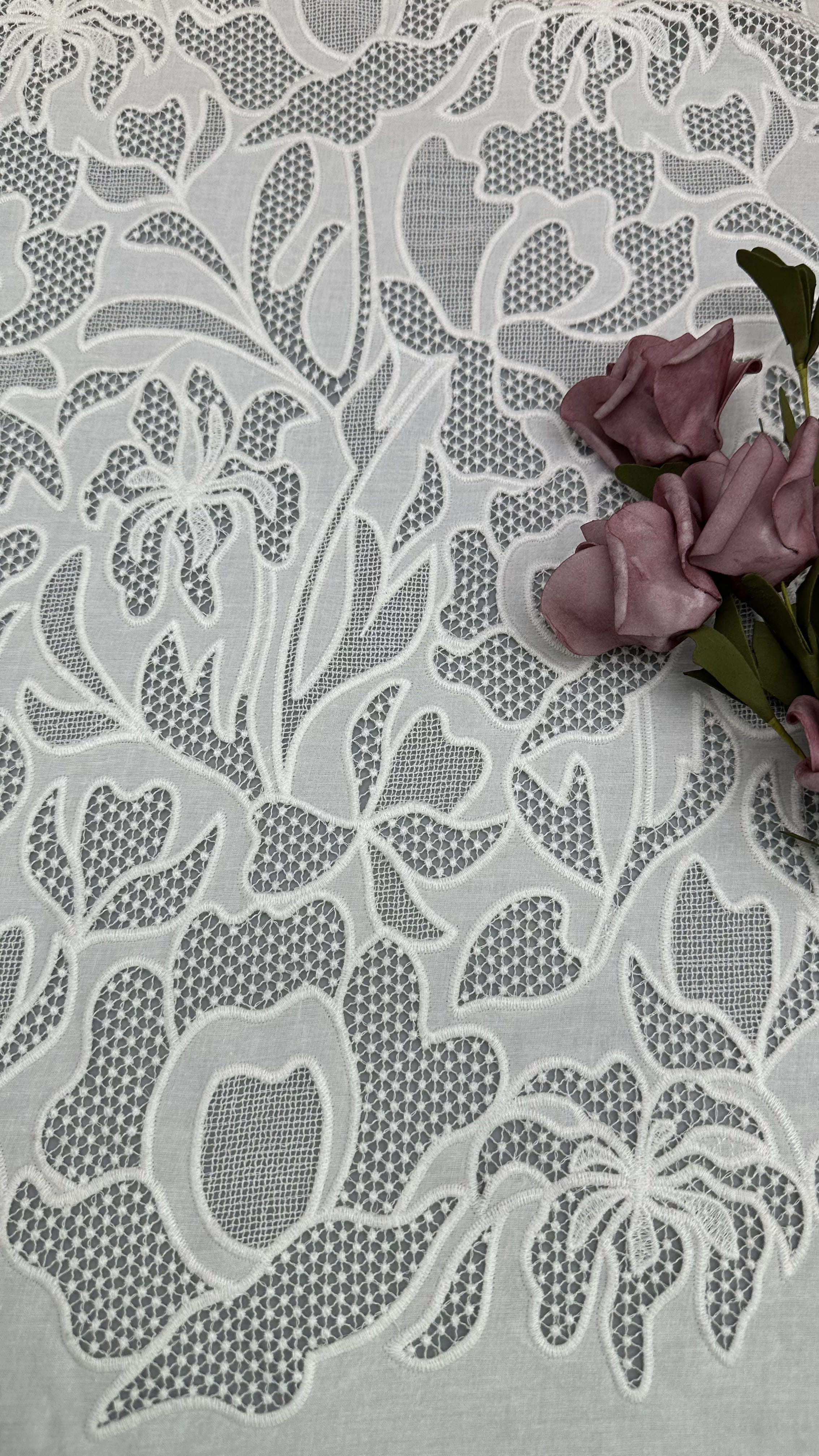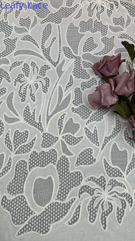 El tejido bordado de encaje con delicados motivos de hojas es una opción popular para vestidos de boda y de fiesta, que ofrece elegancia, textura y detalles intrincados.La tecnología de producción es una mezcla de artesanía tradicional e innovaciones textiles modernas.
