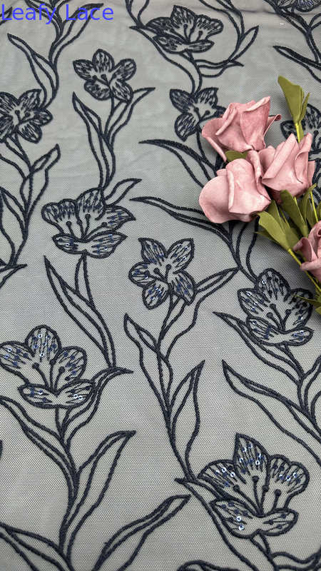 El tejido bordado de encaje con delicados motivos de hojas es una opción popular para vestidos de boda y de fiesta, que ofrece elegancia, textura y detalles intrincados.La tecnología de producción es una mezcla de artesanía tradicional e innovaciones textiles modernas.