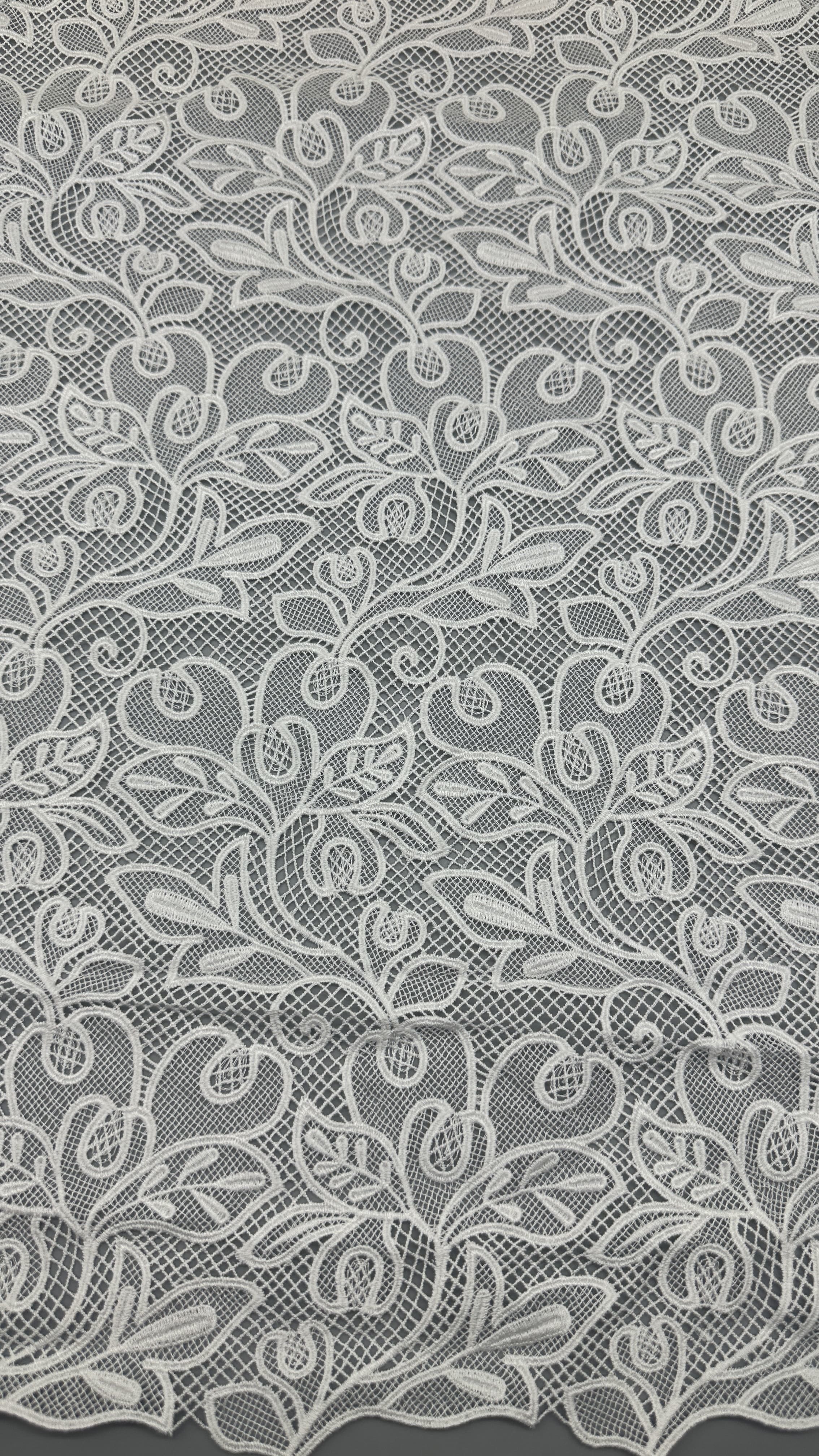 Lace embroidery fabric with delicate leafy motifs is a popular choice for wedding and party dresses, offering elegance, texture, and intricate detailing. The technology behind its production involves a blend of traditional craftsmanship and modern textile innovations.